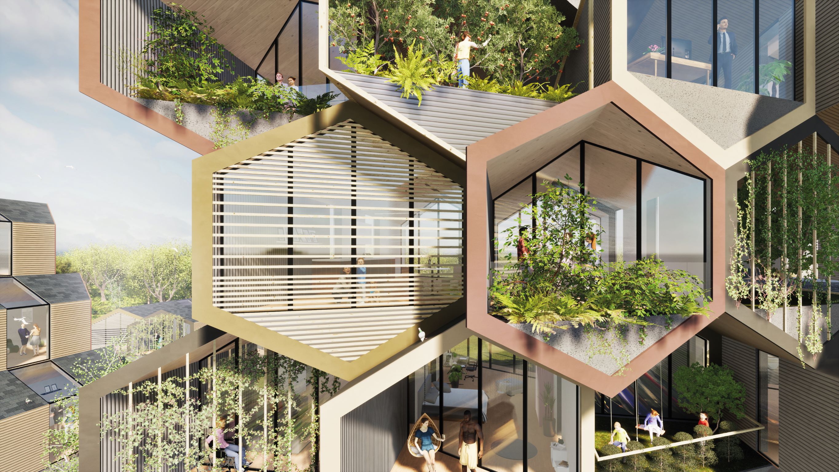 六角形是最能有效均分使用空间的结构型态,HIVE 的六角形模组化住宅设计,更兼顾了可灵活变化组装的便利性。从个别的客制化住宅,到结合多元功能的社区,HIVE 模组化套件都可以依据环境、生活方式等进行不同的应用搭配,比如可以在顶楼设置屋顶花园,也可以依屋主喜好改变外墙设计与用色等。各单元住宅也都拥有隔热、隔音等功能。相互镶嵌的住宅组态,也传达着鼓励跨世代同居的情感重塑理念。在多楼层的模组住宅里,则可加装楼梯、电梯。社区里也将采行无障碍行进动线,以实现全面人性化的居住环境。以木材、石灰石、工业大麻等天然材质为主要建材的 HIVE 套件,最终也都能回归大地完全分解,不会对久远后的环境造成不可消化的污染。